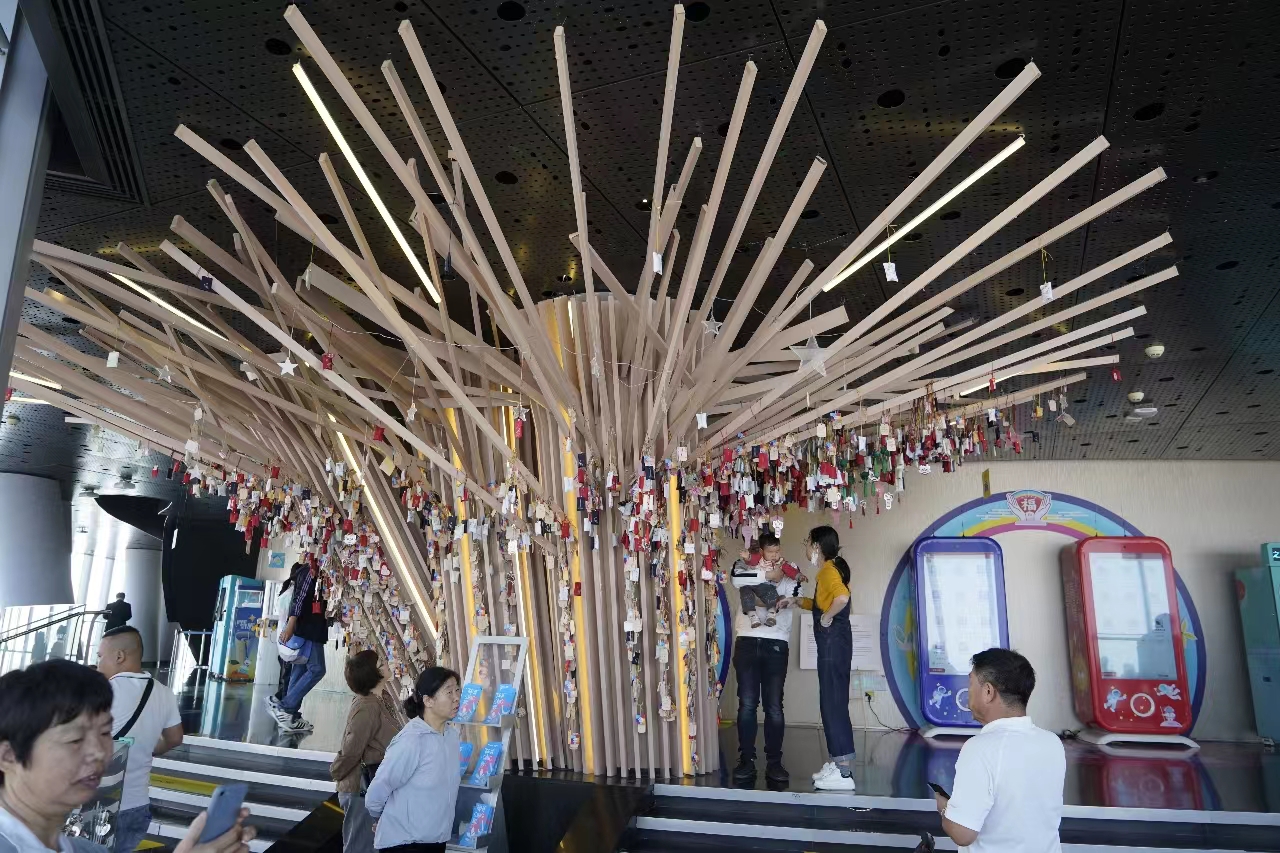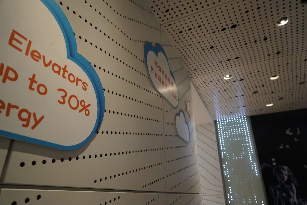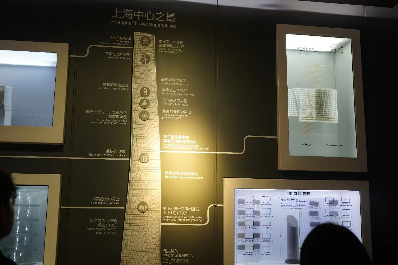 同学们在入场检票之后首先参观的是负二层的展厅,了解到关于“上海中心之最”(如最大的阻尼塔、最高的绿色建筑等)以及国内外众多超高建筑的基本信息。