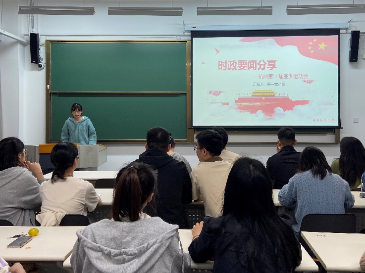 本次会议上,第一党小组围绕“杭州第19届亚洲运动会”作时政要闻分享,通过视频和图片,呈现了“亚运会开幕、亚运会赛事、亚运会闭幕”三方面内容,不仅介绍了本届亚运会的定位、目标、办会理念和原则,讲解了开闭幕上“数字火炬手、记忆之花”等精彩瞬间,还回顾了我国运动健儿在“跆拳道混合竞技、游泳、女子篮球、女子跳马、女子100米、女子100米跨栏”等项目上取得的好成绩,带领全体党员感受竞技体育的热情,传递杭州亚运会坚守和平与发展的人文精神。