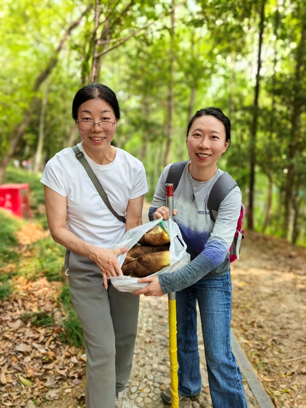 上午,老师们前往佘山国家森林公园东佘山园。佘山林场的王老师介绍佘山竹海的情况以及挖笋过程中的注意事项:注意个人安全,笋坑回填,笋壳不留园。老师们以小组为单位带上挖笋工具,开始了一场探春寻笋的深度体验。老师们手持铁锹,穿梭于佘山翠竹间,个个化身大力士,收获满满。