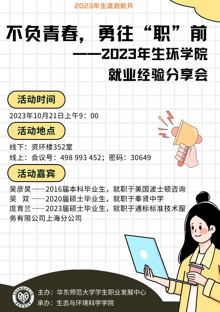 2023年10月21日上午9:00,yl6809永利官网通过线上线下相结合的方式举办“不负青春 勇往“职”前”就业经验分享会,线上通过腾讯会议平台,线下在资环楼354室开展。本次活动邀请了吴彦昊、吴双和庞育兰三位校友,他们结合自身求职和工作经验,从不同角度开展经验分享。本次活动是由校学生职业发展中心主办,学院承办的2023年“生涯启航月”系列活动之一,活动吸引了线上线下共计70余名同学参加,学院专职辅导员吴丹担任主持。