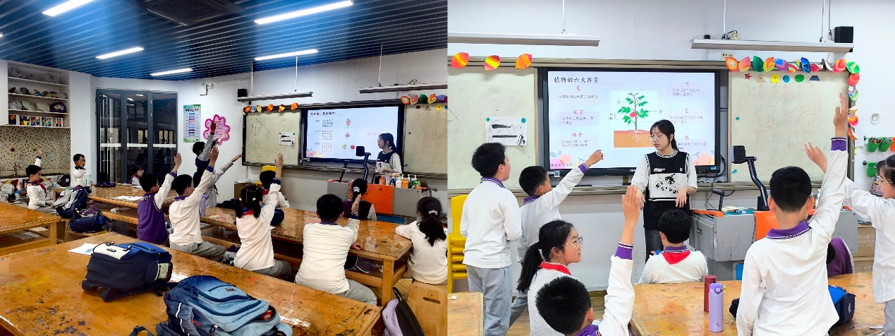 课程伊始,讲师们以“大家午餐吃了什么蔬菜”这一贴近生活的问题开启话题,自然地引出“植物食用部位”的主题。随后,三个有趣的植物谜语登场:“身穿黄衣裳,地下把身藏,脆甜又营养”的胡萝卜;“切菜呛眼睛,味辛辣又甜,像蒜不分瓣,层层裹紫缎”的洋葱;“吃着挺有味,就是嘴遭罪,绿的就厉害,红的更加倍”的青红辣椒。谜语瞬间点燃了同学们的热情,大家纷纷踊跃举手,积极参与猜谜游戏。在揭晓谜底后,讲师紧接着抛出问题:“同学们知道这些蔬菜的食用部位分别是植物的什么部位吗?”这一问题激发了同学们热烈的讨论。讲师们借此机会,系统地介绍了植物的六大器官——根、茎、叶、花、果实和种子,以及它们在植物生长过程中各自发挥的重要作用。