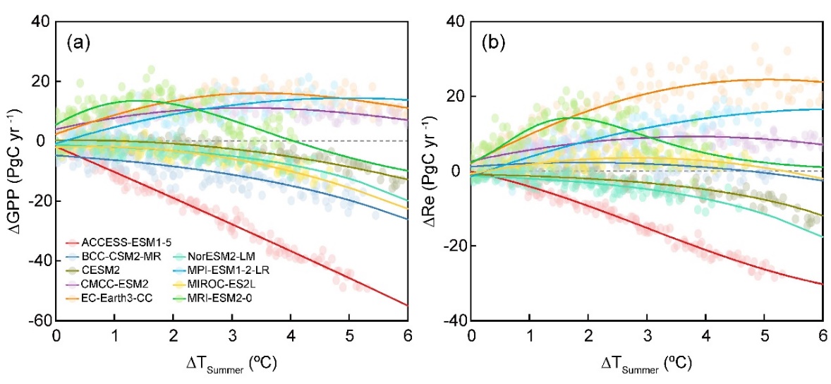 图4. 地球系统模型中生态系统光合作用与呼吸作用对夏季温度变化响应的不确定性。