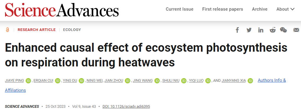 近日,国际学术期刊Science Advances发表了yl6809永利官网夏建阳团队题为“Enhanced causal effect of ecosystem photosynthesis on respiration during heatwaves”的研究论文。该研究融合了收敛交叉映射、野外通量观测和过程模型等技术和方法,定量评估了陆地生态系统光合与呼吸作用之间的双向因果关系,提出并验证了生态系统光合与呼吸作用在高温热浪事件中的“因果关系强化假说”。该研究表明生态系统碳循环的内部过程之间存在复杂的循环因果关系,对理解和预估气候变化背景下的全球生态系统碳汇功能动态具有重要意义。