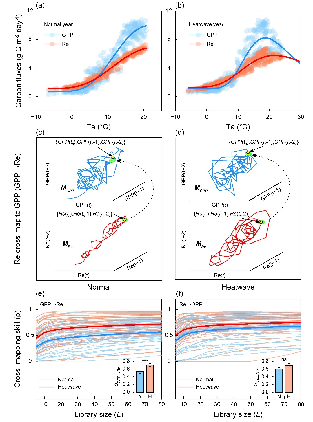 图2. 生态系统光合作用(GPP)与呼吸作用(Re)对温度变化的响应(a-b),GPP与Re之间的因果关系检测(c-d)及结果呈现(e-f)。