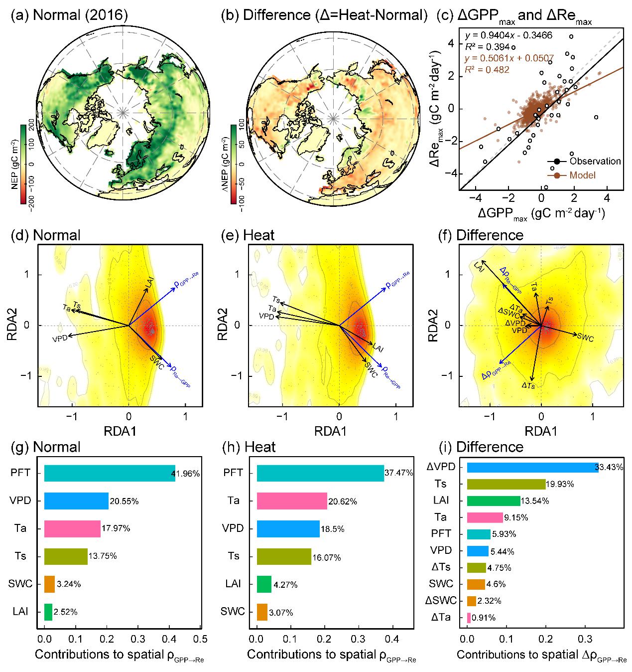 图3. 热浪模拟实验结果和生态系统光合-呼吸因果关系空间变异的调控因子分析。