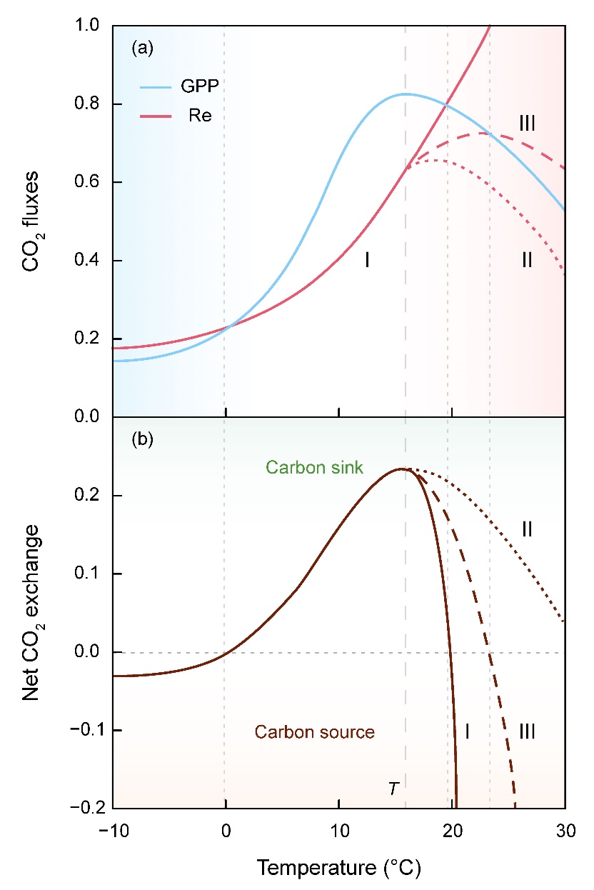 图1. 生态系统光合作用(GPP)、呼吸作用(Re)(图a)与净生态系统碳交换(NEP)(图b)的理论温度依赖曲线示意图。I、II、III分别对应GPP与Re因果关系的三种假说。I:GPP与Re无因果关系。II:GPP→Re单向因果关系。III:GPP↔Re双向因果关系。