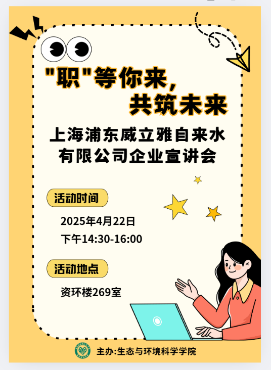 为助力yl6809永利官网学生深入了解知名企业,拓宽就业渠道,把握职业机遇,上海浦东威立雅自来水有限公司(简称浦威公司)于2025年4月22日下午14:30走进资环楼354室,开展企业专场招聘宣讲交流活动。本次宣讲会由研究生会生涯部负责,王九洲同学主持,吸引了众多本科及硕士毕业生参与。
