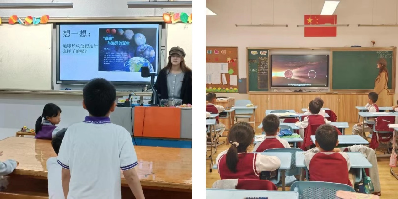 课程开始,小顾老师先向同学们展示了几张与海洋相关的照片,介绍了海洋的基本情况,并抛出问题“地球的形成与海洋的诞生之间的关系?”。而后通过播放精彩的视频为同学们揭秘。