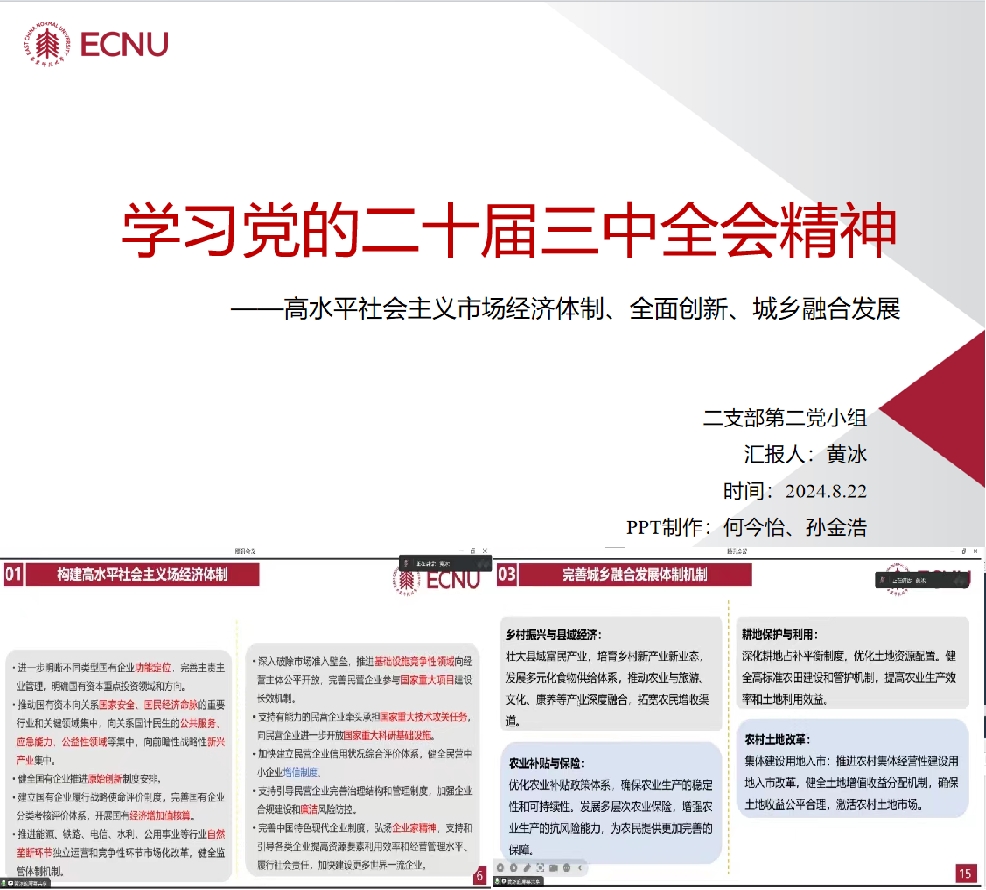 第二小组汇报主题为《学习党的二十届三中全会精神——高水平社会主义市场经济体制、全面创新、城乡融合发展》,以社会主义市场经济体制、全面创新体制机制、城乡融合发展体制机制为切入点,分别介绍了同中国式现代化的关系与内涵,以人工智能、知识产权保护、新型城镇化、耕地保护与利用等方面的例子,生动展现了体制机制改革对激发全社会内生动力和创新活力的重要作用。