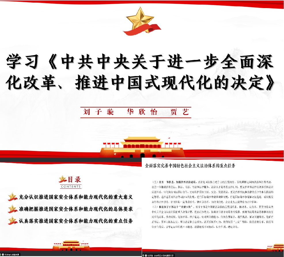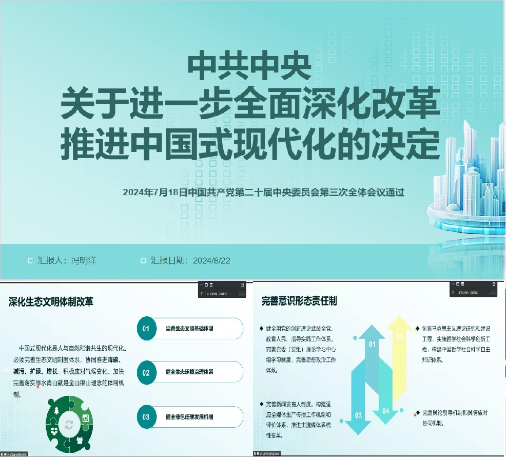 第三小组汇报主题为《中共中央关于进一步全面深化改革推进中国式现代化的决定》,以习近平总书记关于《决定》的说明为开篇,从深化文化体制机制改革、健全保障和改善民生制度体系、深化生态文明体制改革等三个方面进行了分享,各部分又以《决定》内容、现状案例进行了详细介绍。例如,在生态文明方面,小组展示了今年6月5日发布的《环境损害司法鉴定白皮书》,经司法行政机关登记管理的环境损害司法鉴定机构287家,鉴定人5098名,年均办理鉴定业务2.1万余件,为打击环境违法犯罪提供了有力证据支持。