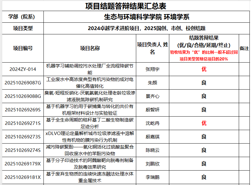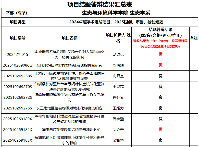 2025年5月21日下午,yl6809永利官网召开2024年卓越学术进阶项目和2025年国创、市创、校创项目结题验收评审会。按照学生申报的系别方向分为两组:生态学系在资环楼234进行,评委为晏黎明、刘慧颖和伏玉玲;环境学系在资环楼273进行,评委为邓晶晶、张颖和甄广印。