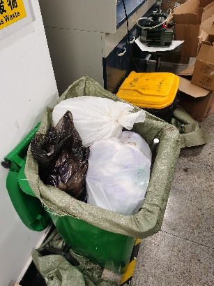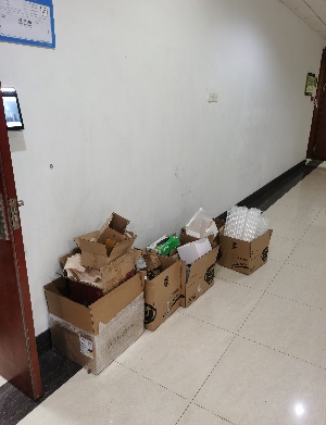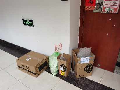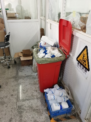 大部分实验室存在实验垃圾大量堆放、没能及时送储的问题。实验垃圾应按照回收要求分类放置,并及时下单送储,不能堆放在实验室或过道里。
