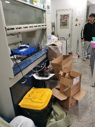有的实验室环境杂乱,物品摆放无序,纸箱随意堆放,物品阻挡过道,需尽快整理。