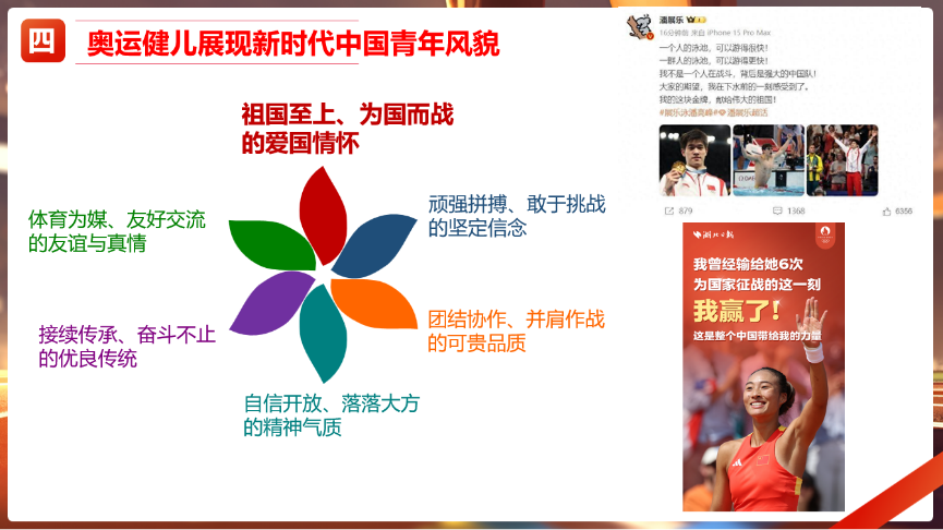 在党课结尾,路葵老师说“无论是倪夏莲给我们带来的坚持与热爱,潘展乐给我们带来的胜利与超越,孙颖莎的拍照换位给我们带来的和平与美好,肖若腾给我们带来的遗憾与失意,都是奥运会给我们带来的精彩瞬间,感谢这个夏天奥运会给我们带来的巨大的正能量,我们更要以奥运精神为指引,迎接人生新阶段的新挑战,努力创造属于自己的闪亮人生。”