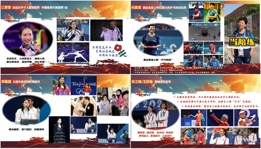 接下来,路葵老师以“剑坛佳人”江旻懳、“乒乓奶奶”倪夏莲、“从跳水皇后到铁面裁判”郭晶晶、“临时组队创造历史”张之臻和王欣瑜的奥运故事为例,分享了他们身上体现出的祖国至上、永不言弃、顽强拼搏、敢于挑战、接续奋斗的体育精神。