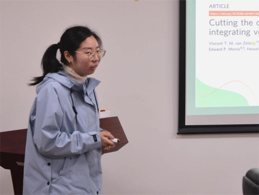 下半场第一位汇报人是来自刘敏老师课题组的曾珂同学,她口头报告的题目是《噪音的不平等分布将影响城市野生动物》。伴随生态环境问题日益严峻,本研究旨在明确考虑有种族针对性的分区做法,对城市噪声与红线类别分布的空间关系进行分析,来系统回顾噪声对城市景观中野生动物的影响。本研究的结论主要有两点:(1)噪音在美国城市HOLC红线等级上分布不公平;(2)不公平的噪音可能会导致城市野生动物多样的复杂生物反应。第五位汇报人是来自黎绍鹏老师课题组的赵国蒙同学,他主要就文献《拔除入侵种后对当地群落的影响》作了汇报。本研究结果表明:(1)浦江样地中,拔除入侵种后,区域群落的丰富度和多样性并没有显著改变;(2)在更长的时间尺度上,区域丰富度和多样性不太可能发生显著改变;(3)零模型结果表明,盖度增加的物种所占比例并不会对结果产生显著影响;(4)拔除入侵种后,与入侵种亲缘关系更远的物种更有可能成为输家,甚至导致物种消亡。第六位汇报人是来自周小奇老师课题组的毛欣钰同学,她报告的题目是《北美最大湿地复合体的甲烷排放量预计将大幅增加》。研究表明,CH4排放受到水文、温度、植被和湿地大小的影响,而PPR湿地 CH4排放量很大程度上取决于湿地总范围,无论未来湿地面积如何变化,PPR的甲烷排放量都预计在2100年时增加两到三倍。最后一位汇报人是来自邓杰老师课题组的张子扬同学,他报告的题目是《海草和海洋细菌之间的陆生型固氮共生》。该研究发现了生活在贫营养地中海中最高产量的海草P. oceanica的根组织内具有能固氮的海洋细菌,它可以向海草提供氨和氨基酸以换取糖与海草形成共生,即可联想到陆生植物固氮共生的特征。