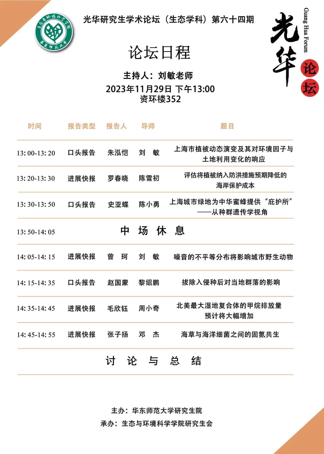 2023年11月29日13:00,yl6809永利官网第64期研究生光华学术论坛(生态学科)在资环楼352室顺利举行,本期论坛由yl6809永利官网刘敏老师主持。