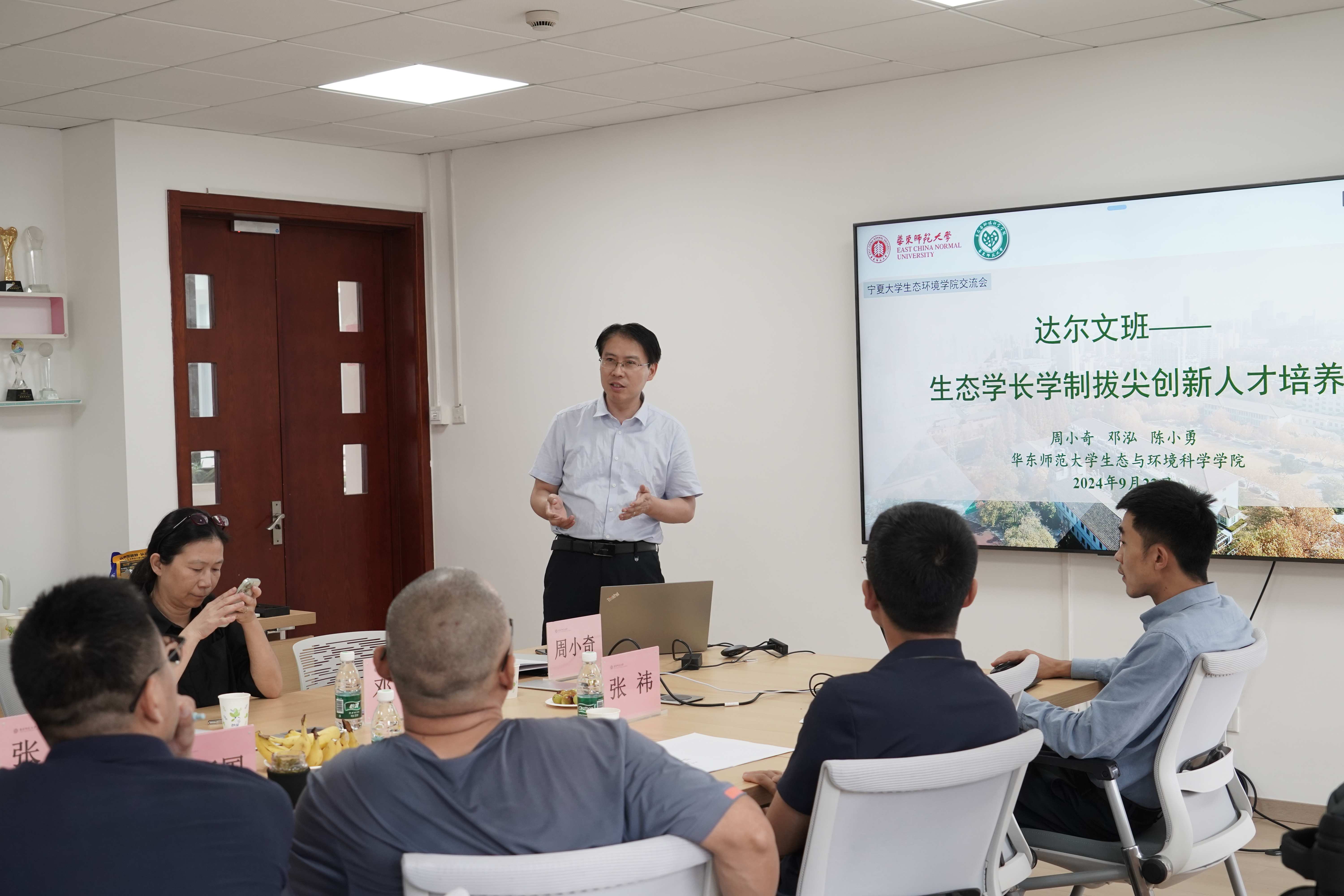 9月21日下午,在院党委书记嵇渭萍的主持下,双方还进行了座谈交流。院长陈小勇讲述了华东师范大学的建校历程,并全面介绍了学院的组织架构、学科建设、科研团队建设、人才培养和科研成果等方面的情况。杨振东回顾了宁夏大学生态环境学院的成立和组建过程,分析了学院在建设过程中面临的挑战,并提出了学院未来的发展策略。座谈会上,双方就如何制定学生培养方案、促进科研成果产出以及开展未来合作等问题进行了深入的探讨和交流。