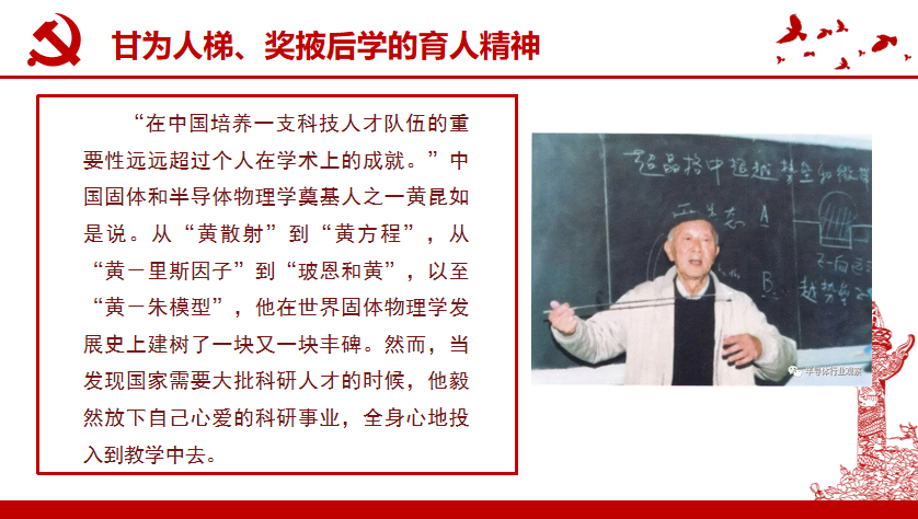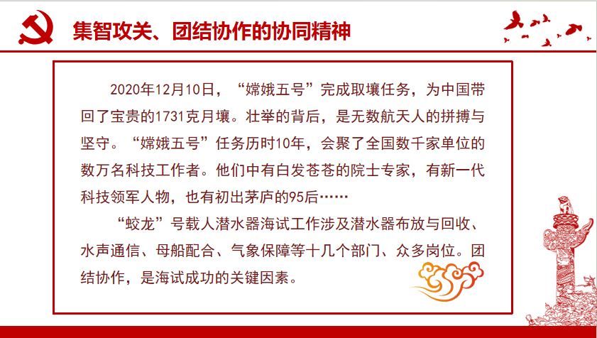 第六部分:甘为人梯、奖掖后学的育人精神。一代又一代科学家之间传递的不仅有知识、方法,更有支持青年科技人才在重大科研任务中“挑大梁”的精神和“门风”。中国科技工作者集智攻关、团结协作,才创造了举世瞩目的科技成就。