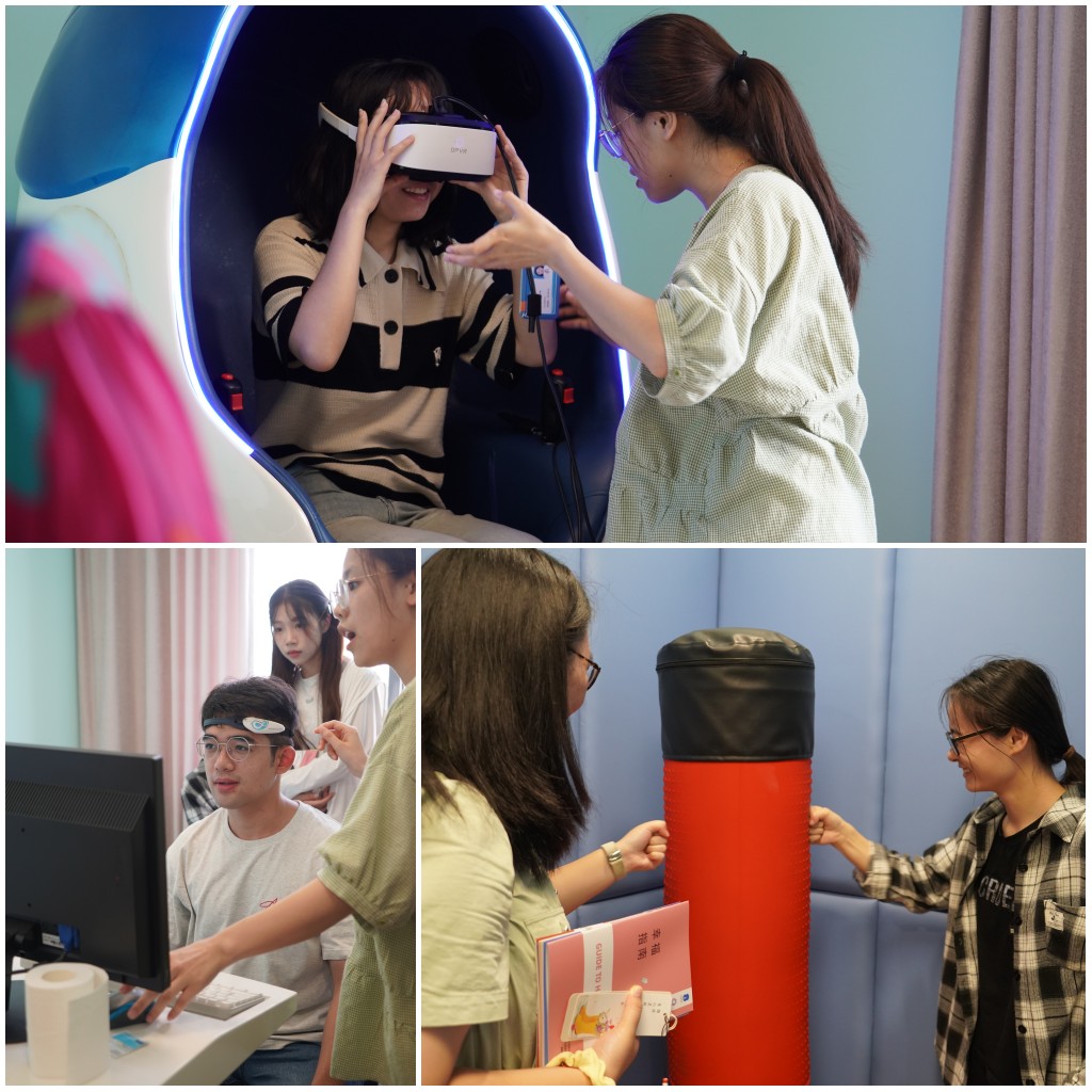 季老师为大家介绍了中心的概况、心理咨询的预约流程、心理中心开展的各类活动。大学生心理健康教育与咨询中心各功能室布置温馨,同学们在季老师的带领下参观了心理中心智能心理训练系统。季老师向大家介绍了减压放松舱、EEG身心反馈训练系统、智能击打呐喊系统、虚拟现实系统等设备的功能和使用方式,让同学们一探心理中心的全貌,同时也对心理工作的定位和理念有了更进一步的了解。在陈老师讲解后,同学们亲身体验了智能心理训练系统的各种有趣的设备,放松心情,也舒缓了压力。
