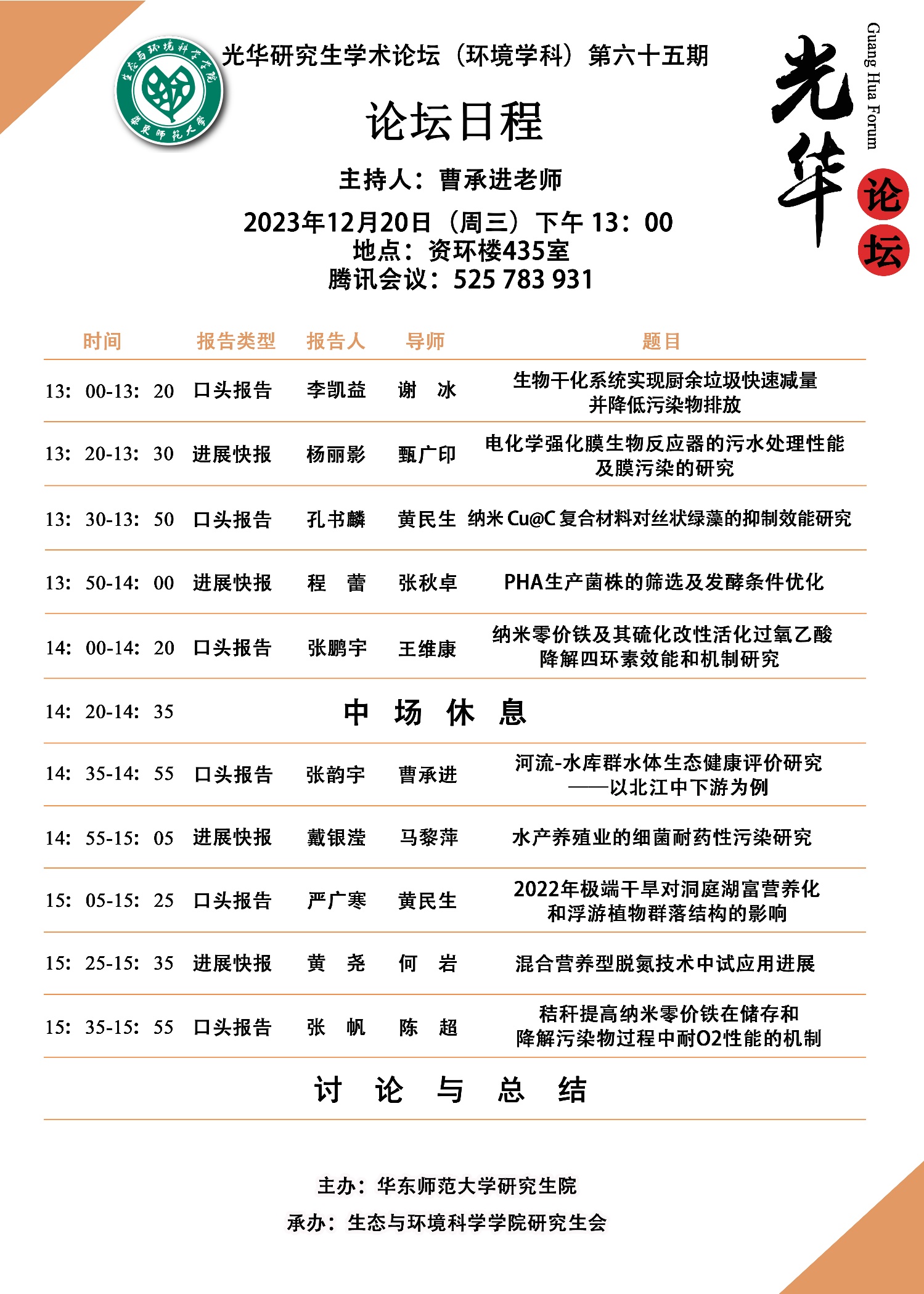 2023年12月20日13:00,yl6809永利官网第65期研究生光华学术论坛(环境学科)在资环楼435室顺利举行,本期论坛由yl6809永利官网曹承进老师主持。
