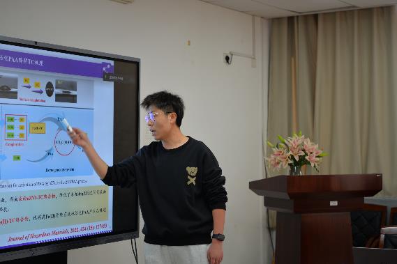 上半场第一位汇报人是来自谢冰老师课题组的李凯益同学,他口头汇报的题目是《生物干化系统实现厨余垃圾快速减量并降低污染物排放》。目前,无机氮转化的机制已经较为清晰,但有机氮的转化及对氨化作用的贡献仍不明确;无机氮转化仅涉及特定微生物和功能基因,而有机氮转化几乎所有微生物均能参与。本研究探究了BD工艺中的赋存氮素转化关系与损失形式,为厨余垃圾高效低碳资源化提供了新依据。第二位汇报人是来自甄广印老师课题组的杨丽影同学,她进展快报的题目是《电化学强化膜生物反应器的污水处理性能及膜污染的研究》。EMBR中活性污泥的沉降性能显著提高。沉降性较差的污泥更容易发生膜污染,说明电场的存在降低了污泥产生膜污染的潜力。随着反应器长时间的运行,伴随污泥黏度上升的同时,污泥的沉降性能也在逐渐变差,但EMBR中悬浮污泥的沉降性能始终优与CMBR。第三位汇报人是来自黄民生老师课题组的孔书麟同学,他口头汇报的题目是《纳米Cu@C复合材料对丝状绿藻的抑制效能研究》。孔同学对目前城市水环境中沉水植物种植水体丝状绿藻孳生现状进行现场调研,探究纳米Cu@C/载体复合体抑藻效能研究,通过实验,研究得出主要结论:TN、TP、CODMn、Cu2+、发光细菌急性毒性随四种材料所含CCCSNs浓度的增加而增加,整体呈“缓-急-缓”的上升趋势。第四位汇报人是来自张秋卓老师课题组的程蕾同学,她进展快报的题目是《PHA生产菌株的筛选及发酵条件优化》。PHA家族中结构最简单、应用最广泛的是PHB,传统塑料降解需要100年,而PHB只需要12个月即可完全分解。因此需要寻找一种高产、低成本的PHA合成途径。本篇文章提供了这一个合成途径:首先是利用廉价底物,然后培养构建优势菌株,最后降低分离纯化成本。上半场最后一个上台的汇报人是来自王维康老师课题组的张鹏宇同学,他口头汇报的题目是《纳米零价铁及其硫化改性活化过氧乙酸降解四环素效能和机制研究》。针对Fe(II)再生率低的问题,张同学选用nZVI为活化剂活化PAA,研究其对TC降解的效能和机理。通过构建了nZVI/PAA高级氧化体系,该体系在宽pH范围,可以短时间内可实现四环素的高效去除。