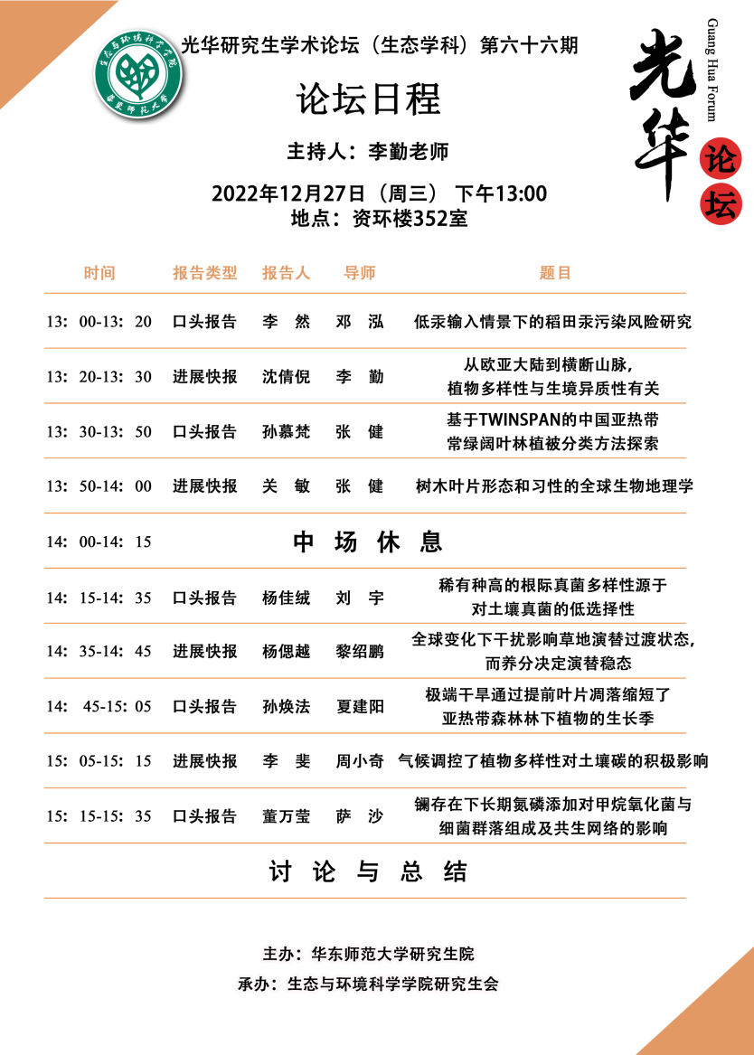 2023年12月27日13:00,yl6809永利官网第66期研究生光华学术论坛(生态学科)在资环楼352室顺利举行,本期论坛由学院李勤老师主持。