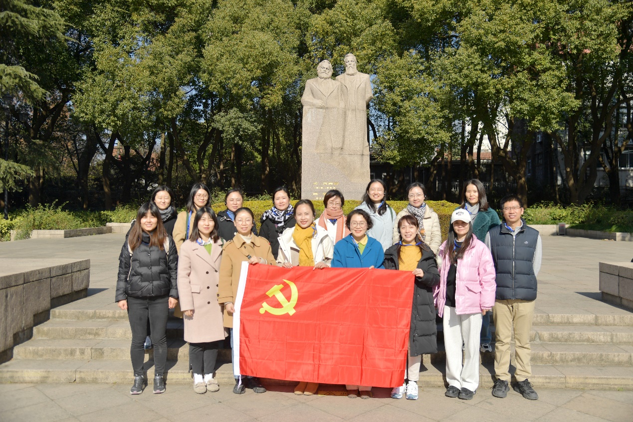 复兴公园是上海市中心唯一的法式园林风格公园,具有百年历史,见证了中国近代史的变迁。老师们来到坐落于公园大草坪的马克思和恩格斯纪念雕像前,沈老师为大家讲解了复兴公园的历史、我国第一座大型马恩纪念雕像的建造历史、雕像在复兴公园落成的原因等。雕像中的马克思和恩格斯神态端庄,两位伟人炯炯有神注视着前方,仿佛在展望未来。