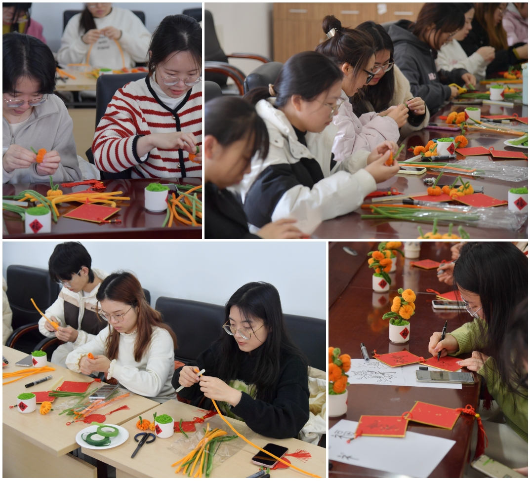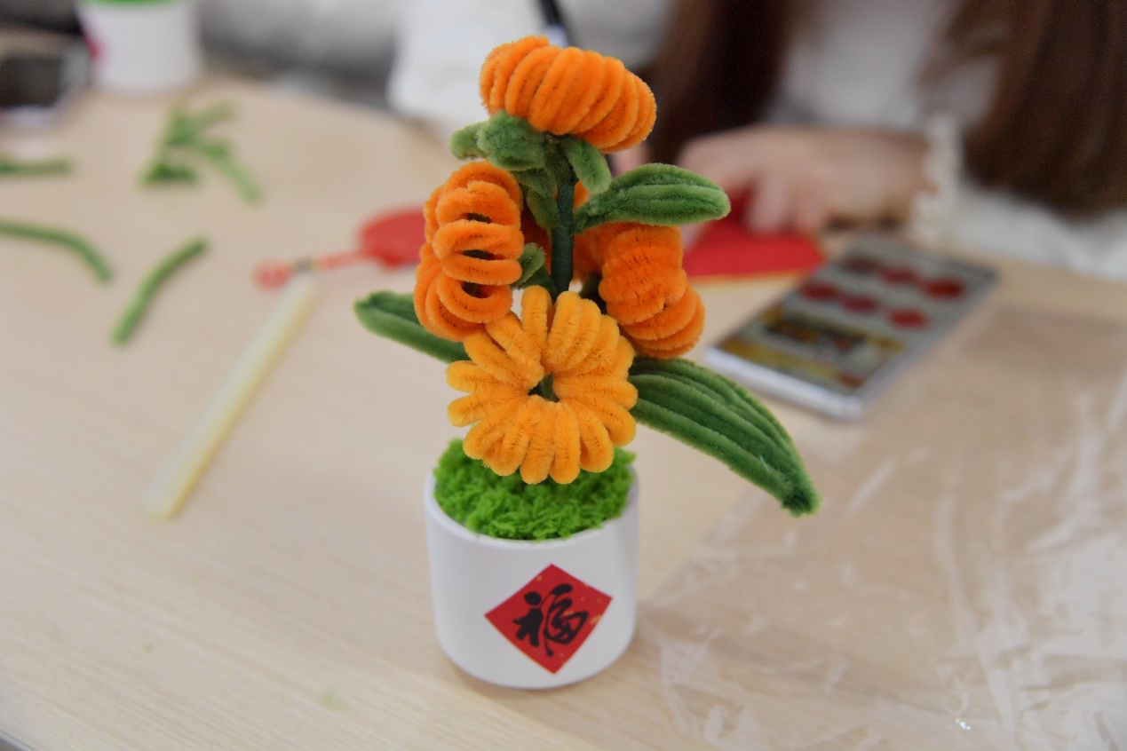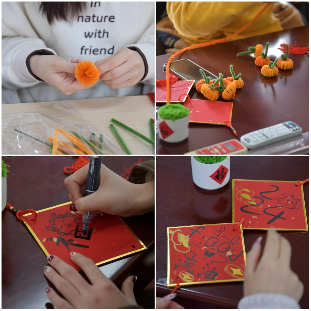 同学听得津津有味,纷纷自己动手尝试,在几位老师的细心指导下,手上的扭扭棒经过一番缠绕、交叉、扭动,一个个精巧可爱的小柿子挂满枝头。参与的同学都说不仅锻炼自己的动手能力,更是感受到浓浓的年味和未来的美好祝愿。