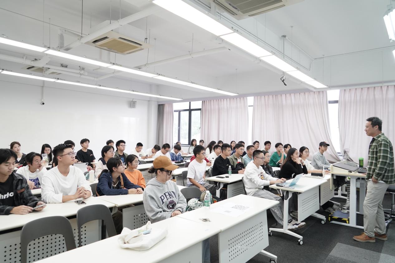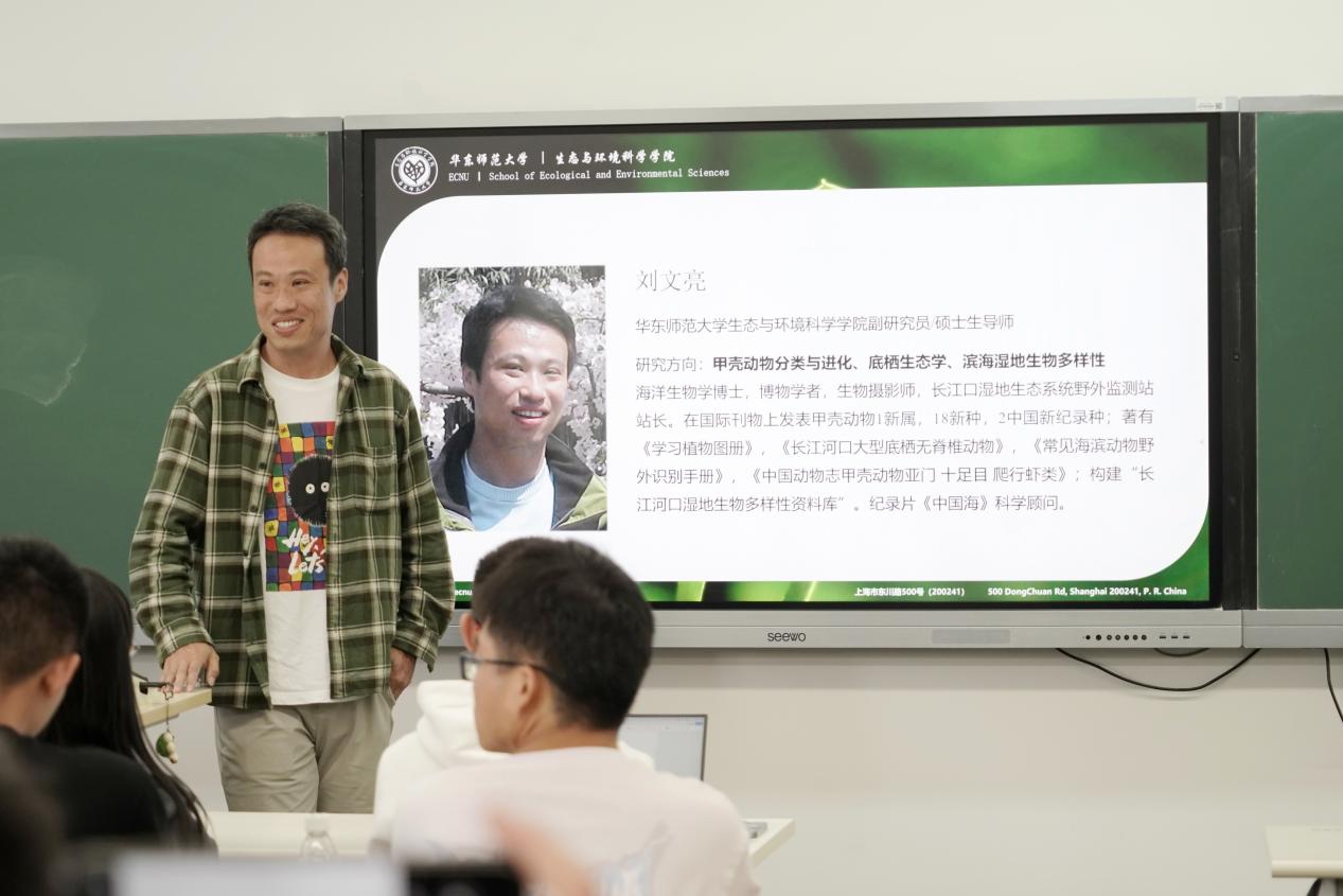 讲座以刘老师自己编导的视频《崇明故事·西沙剪影》为开篇,带领同学们领略了崇明岛的生物多样性,走进了刘老师在岛上的工作环境与研究内容。接着,他生动地讲述了自己的成长历程和工作经历,分享了生态研究中的有趣发现,并透露了自己作为科学顾问参与《舌尖上的中国》和《蔚蓝之境》等节目的幕后故事,让同学们对生态保护有了更深的认识。