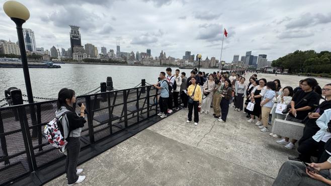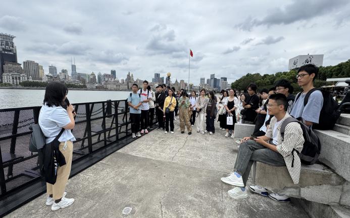 在结束了上海中心的参观后,同学们前往滨江大道,一边欣赏沿岸的建筑物,一边聆听5位上海本地同学对上海值得参观景点的介绍。