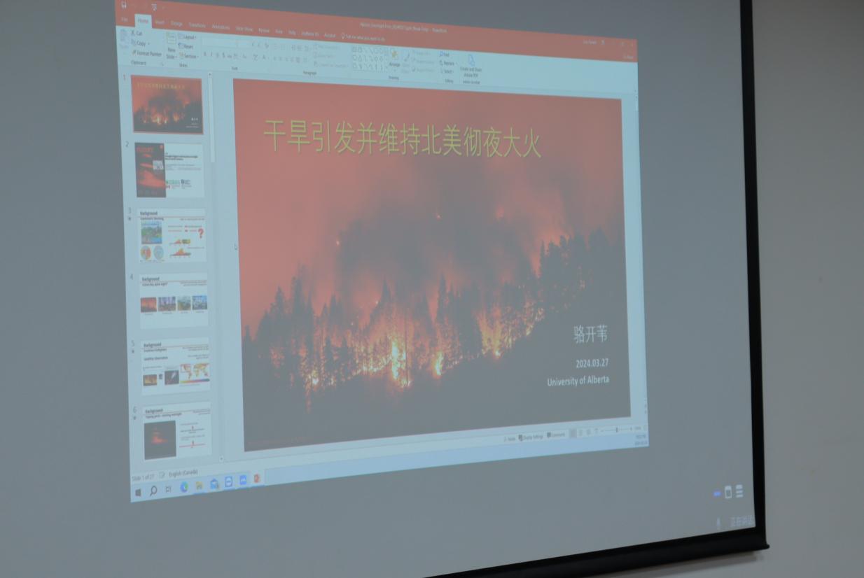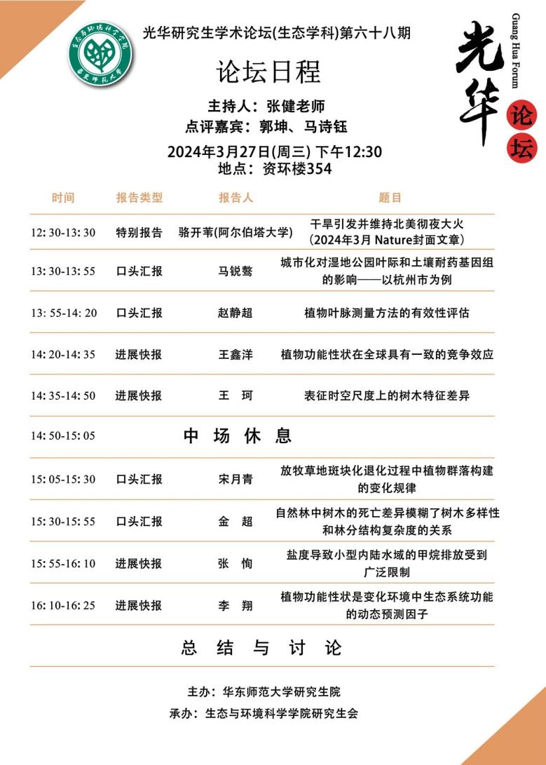 上半场第一位汇报人是来自阿尔伯塔大学的骆开苇同学,他带来了一场特别报告,题目是《干旱引发并维持北美彻夜大火》(2024年3月Nature封面文章),骆同学详细介绍了此研究的亮点,并着重分析了这次火灾的主要因素,最后向大家总结分析了大型火灾的各项数据以及大型火灾未来的趋势和情景。第二位汇报人是马锐骜同学,他口头汇报的题目是《城市化对湿地公园叶际和土壤耐药基因组的影响——以杭州市为例》,马同学主要分析了城市化梯度下的植物叶层和土壤趋势:植物叶层与土壤中的微生物和抗生素抗性基因(ARGs)分布存在显著差异。城市、城郊和农村环境中的变化趋势各异,其中城市地区的病原体浓度更高。第三位汇报人是赵静超同学,她口头汇报的题目是《植物叶脉测量方法的有效性评估》,其中主要结论为:1.单片叶子中叶脉闭合度随取样面积的整体变化范围不大;2.一片叶子中随取样面积的改变,叶脉密度整体变化范围不大。接下来是第四位汇报人王鑫洋,他进展快报的题目是《植物功能性状在全球具有一致的竞争效应》,该论文主要结论:1.在竞争状态和无竞争状态下植物功能性状存在权衡;2.在无竞争状态下有更高生长速率的个体在竞争状态下有更低的竞争抵抗力和对相邻个体更低的竞争效应。上半场最后一位汇报人是王珂同学,她的进展快报题目是《表征时空尺度上的树木特征差异》,主要结论是:1.性状方差的时间尺度与性状相关;2.时间均值-方差尺度关系与性状相关。