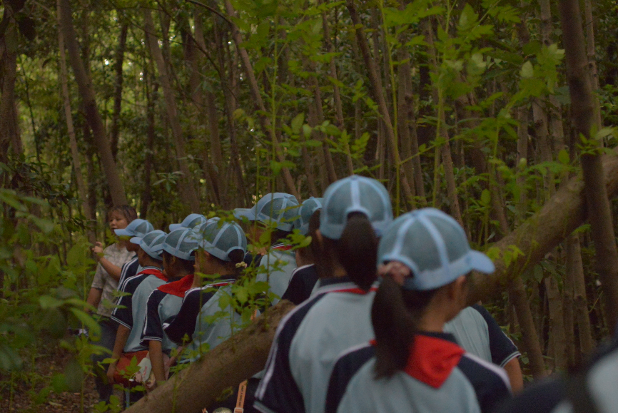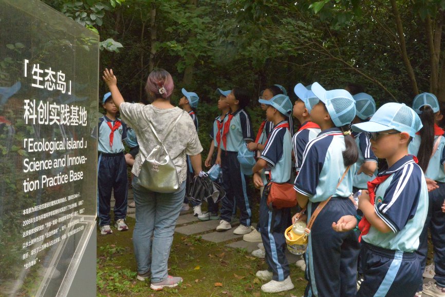 紧接着,同学们移步到了绿意盎然的生态岛。生态学博士研究生罗心怡为大家介绍了生态岛的历史:这里原为建筑垃圾堆场,后由yl6809永利官网研究团队经过精心设计与生态修复而成,占地面积3534平方米。岛上采用“异龄-复层-常绿落叶混交林”模式,种植了青冈、青栲、红楠、枫香等上海乡土树种,形成了丰富多样的生态系统。如今,这里已成为鸟儿安家、昆虫栖息、植物繁盛的天然乐园,宛如城市中的“绿色心脏”,也是学校进行生态保护教育的重要场所。