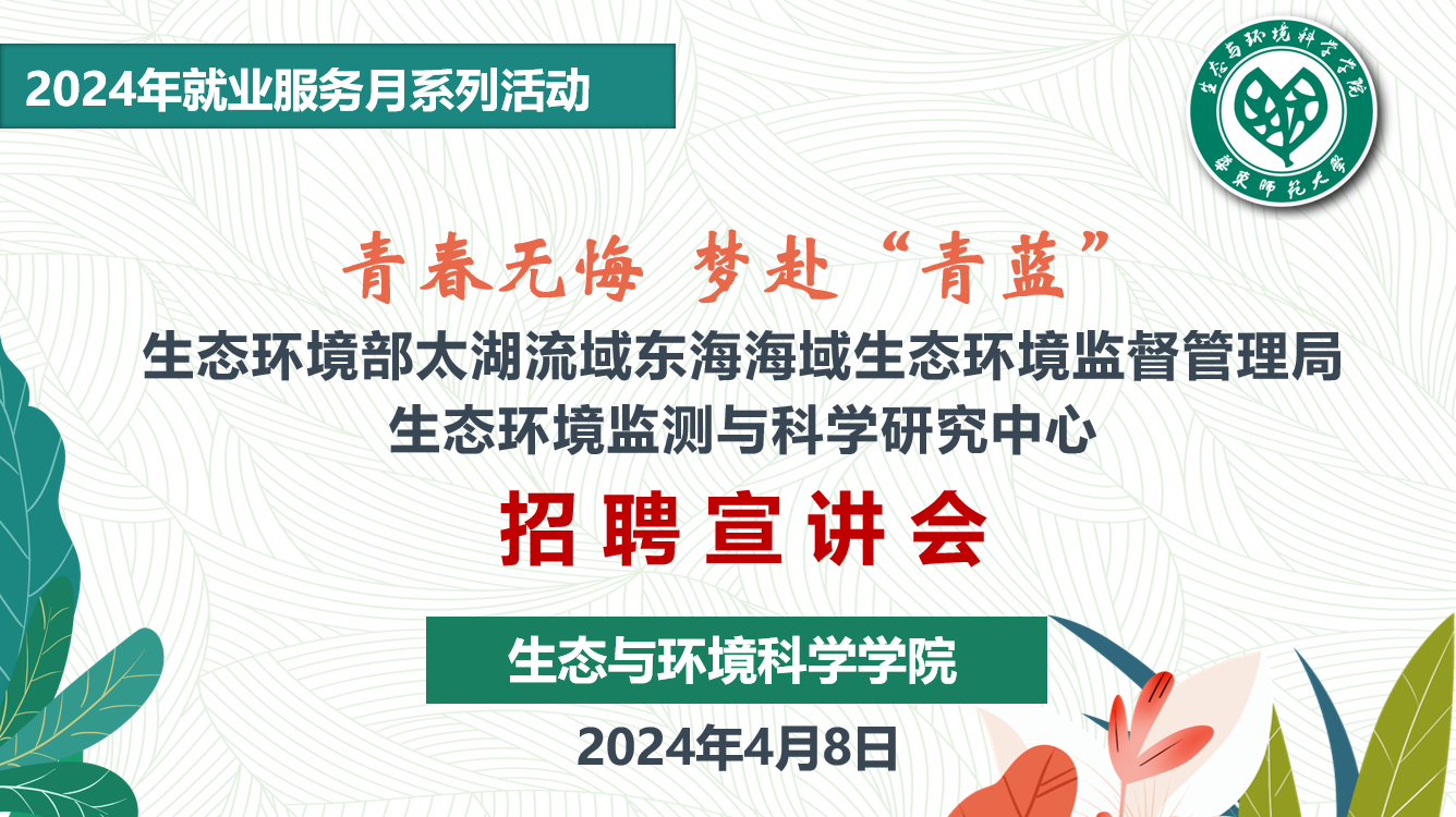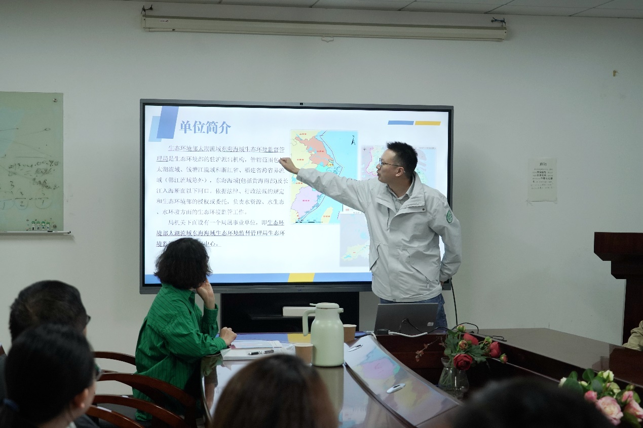 为扎实做好2024届毕业生就业推进工作,拓宽就业渠道,密切学院与用人单位之间的联系,2024年4月8日下午,生态环境部太湖流域东海海域生态环境监督管理局生态环境监测与科学研究中心(以下简称:监测科研中心)在闵行校区资环楼435举办专场招聘宣讲会。本次宣讲会是由校学生职业发展中心主办,yl6809永利官网承办的2024年“就业服务月”系列活动之一。30余名来自yl6809永利官网、河口海岸科学研究院等单位的研究生报名参加此次宣讲会,yl6809永利官网党委副书记路葵、副院长陈雪初参加此次活动。