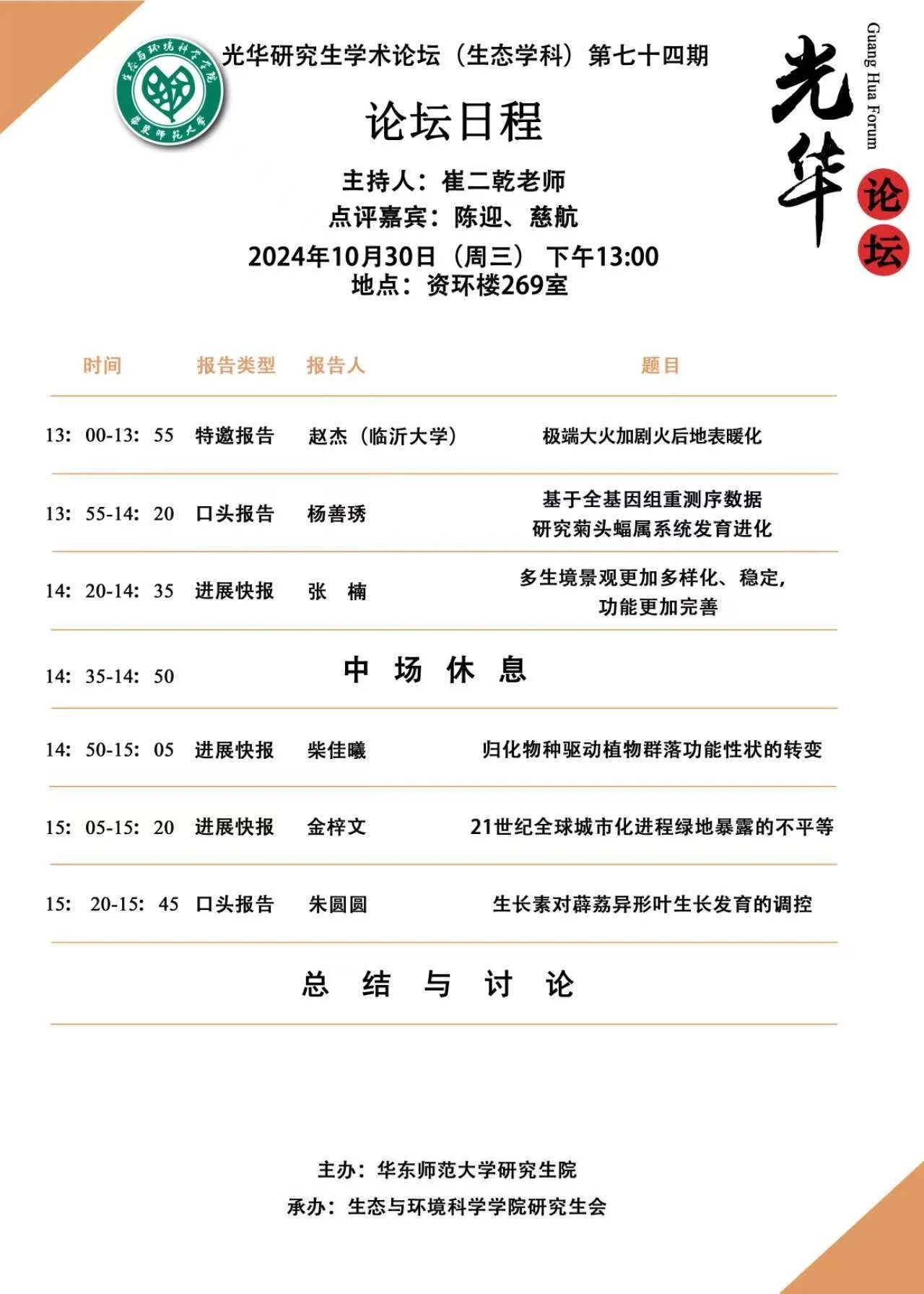 2024年10月30日下午13:00,yl6809永利官网第74期光华学术论坛在资环楼269室顺利举行,本期论坛由学院崔二乾老师主持。