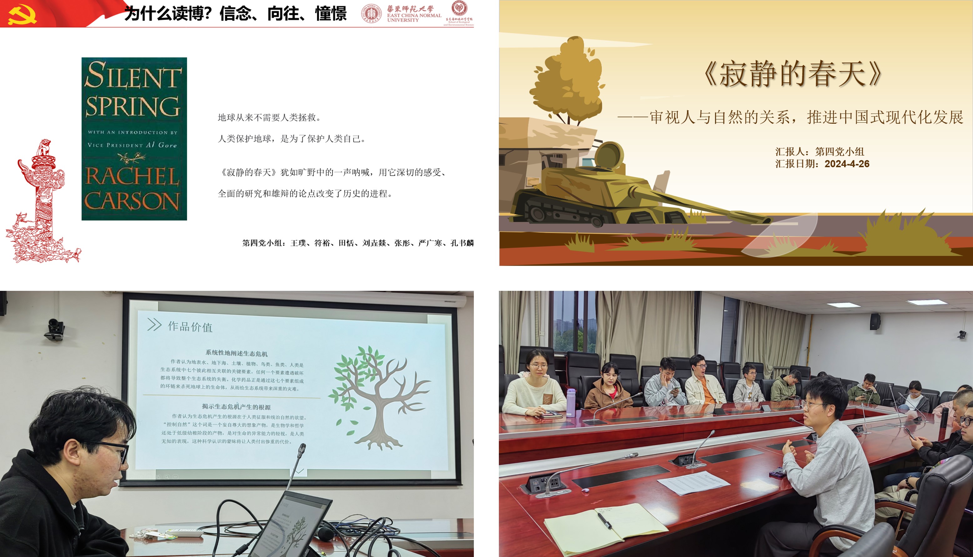 首先是第四党小组分享的书籍《寂静的春天》,带领大家重新审视人与自然的关系,回忆选择生态与环境专业以及读博的初衷。本书的作品价值在于系统性地阐述生态危机、揭示生态危机产生的根源、倡导生态责任和提出解决生态问题的思想方法。《寂静的春天》犹如旷野中的一声呐喊,敲响了人类将因为破坏环境而受到大自然惩罚的警世之钟,也促进了中国式现代化的发展。我们国家坚定不移走生产发展、生活富裕、生态良好的文明发展道路,实现中华民族永续发展。
