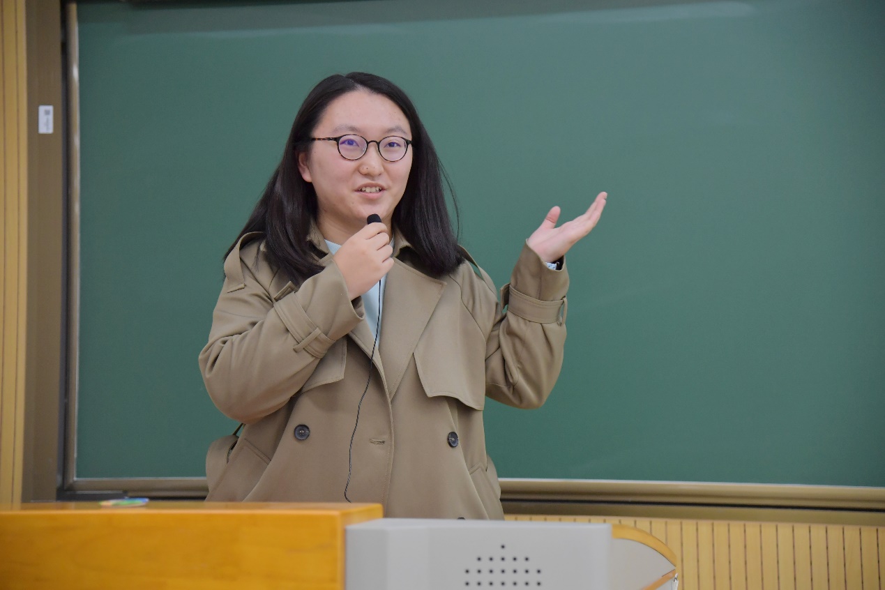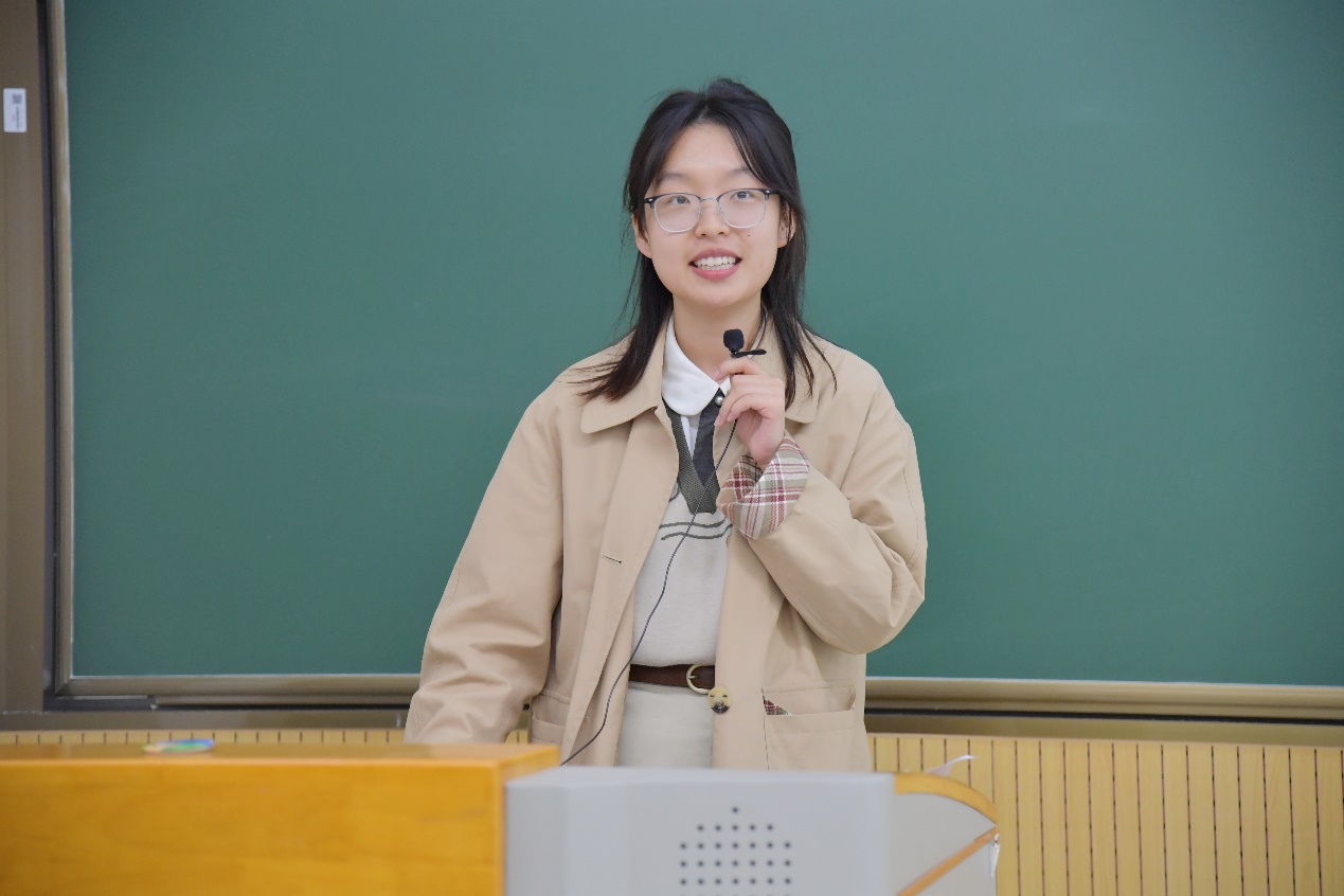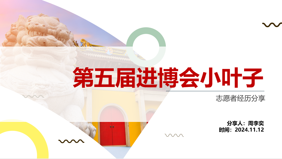 活动第二部分,由学院参与过进博会志愿服务工作的两位“小叶子”分享他们的体验与感受。第一位是第五届进博会志愿者、生态学专业研究生周李奕同学,她以今年进博会瑞幸咖啡豆亮相巴西馆为引入,强调了进博会举办的经济与政治意义,并和同学们分享了自己在进博会志愿者工作期间的感想,同时带领大家一同“云逛展”开拓眼界,并在最后将每年我校进博会志愿者报名的时间、流程做了简单介绍。第二位是第六届进博会志愿者、2024级环境学硕士研究生徐寒雨同学,分享了她去年在本科期间参与到进博会志愿服务的故事,从前期培训到会期正式上岗,她给大家讲述了党群服务站的功能、作用,以及在此志愿服务的心得体会。在她看来在进博会担任志愿者的时间是一段非常难忘的经历。