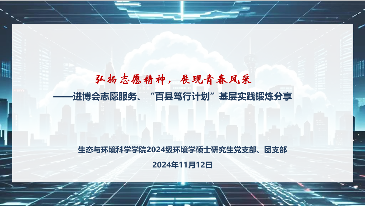 中国国际进口博览会作为促进世界各国加强经贸交流合作,推动开放型世界经济发展的重要举措,为鼓励同学们深入了解进博会,在第七届进博会闭幕之际,2024年11月12日晚,2024级环境学硕士研究生党支部、团支部在四教110联合举办进博会志愿服务、“百县笃行计划”基层实践锻炼分享,活动由路葵老师主持。
