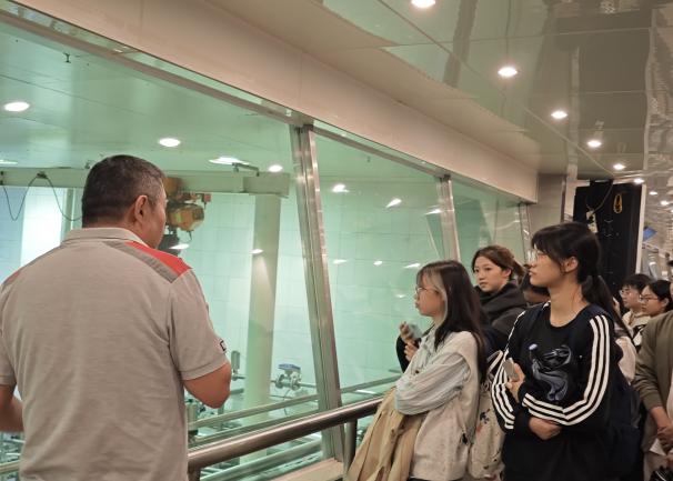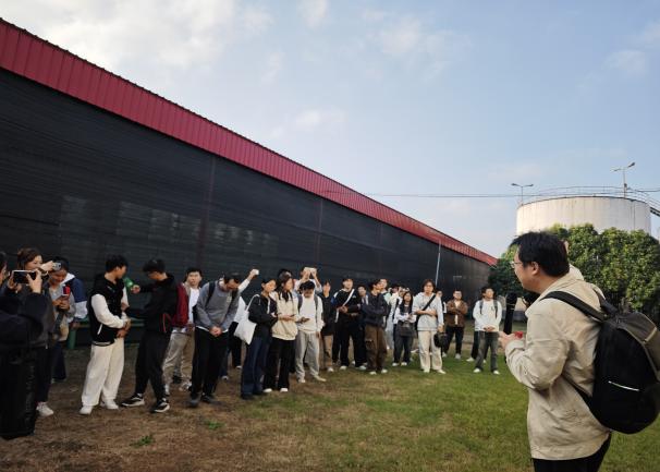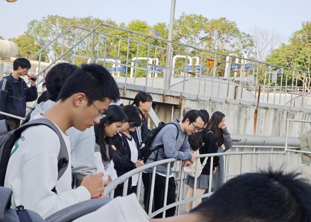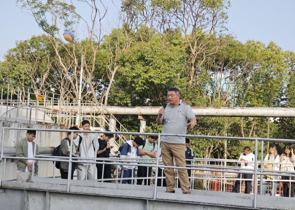 随后,同学们在老师的带领下前往参观污水处理站。申美公司采用活性污泥法和生物膜法作为污水处理工艺。工厂内的污水经过初沉池、调蓄池、曝气池、二沉池后纳管排放,同时在污水处理的二沉池中,还配备水质在线监测仪,通过这一设备可对出水水质进行有效监测,一旦出水的水质不达标就可以及时监测到并进行再处理。