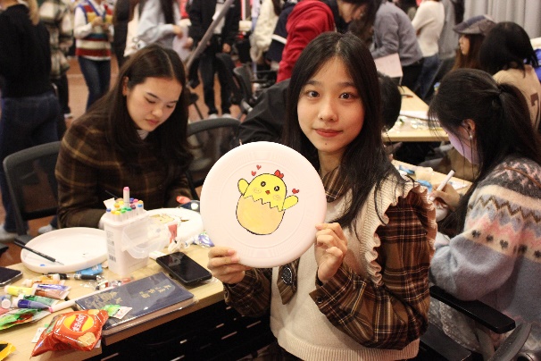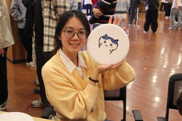 “DIY飞盘”区域聚集了大量对创意手工充满热情的同学。活动开始前,工作人员早已准备好了各式各样的飞盘材料、画笔、颜料,等待大家的创意“改造”。