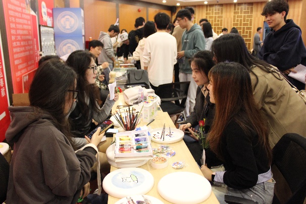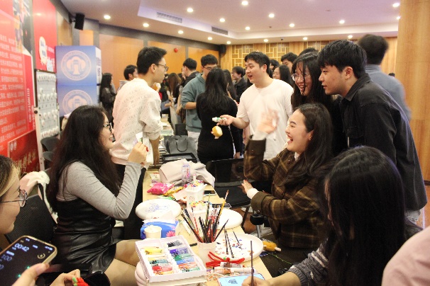 本次联谊活动通过以小组为单位的破冰游戏,迅速打破了初见的拘谨与陌生,让大家在欢声笑语中逐渐熟络起来。随后,参与者们便可自由组队,投身到游园会的各个精彩环节中。各学院精心准备了互动小游戏,有增进了解的“你划我猜”“爱的传递”等,还有脑力挑战“拼贴诗集”“正话反说”等,以及各种手工体验活动,包括“DIY飞盘”、“扎染”、“扭扭棒手工”、“扇画”等。每一个活动都吸引了许多热情的参与者,现场气氛热闹非凡。
