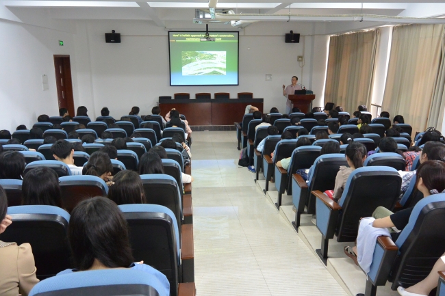 第二场讲座是由中山大学黎夏教授带来的《空间信息技术在生态环境研究中的应用》。黎教授在土地利用监测、城市化过程及其环境影响、城市资源与环境管理、海岸带遥感监测等方面给同学们做了详细的介绍,使学生了解到地理信息系统在环境与生态方面的诸多应用,为同学们今后的学习研究提供了新思路。