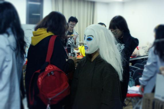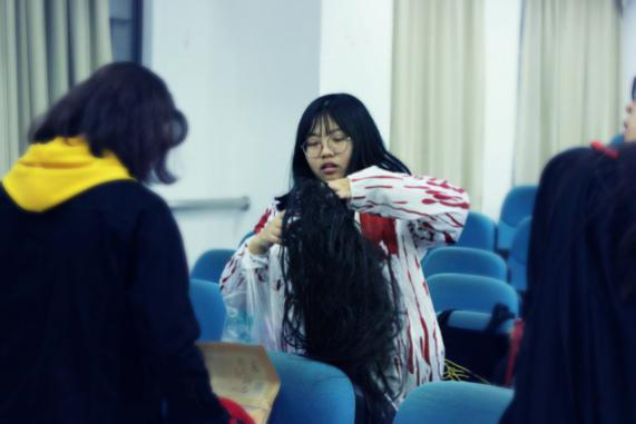 在活动开始前,实践部的工作人员开始了紧张的筹备工作。工作人员各司其职,分配好各自的任务:负责装饰的同学领取道具,分散到各个场地布置;策划的同学与扮鬼的同学沟通协调,分发扮鬼的装饰,仔细讲解注意事项和活动安排。在五点半之前,准备工作已经完成,扮鬼的同学也各自到达指定位置,相关设备调试完毕,一切准备就绪。试玩组开始体验,并仔细检查各地疏漏,最终在六点正式向报名玩家开放。