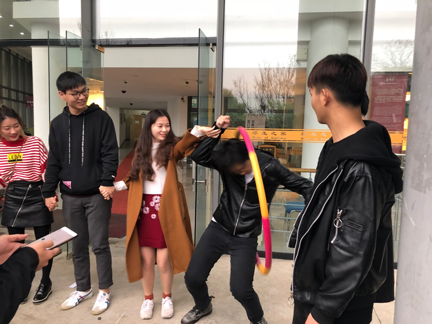 经过室内活动后,第二环节是定向越野。每组成员领取华师大的地图,前往地图上的标记点找到关主并且完成关主要求的任务,完成时间最短的组将会获得积分,赢取最后大奖。各个关卡各具特色,考验团队协作的神笔马良和60秒不NG,考验肢体协调能力的心有灵犀和呼啦圈过人…即使当天下起了小雨,也无法浇灭大家参与活动的热情。
