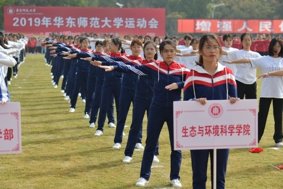2019年10月29日,天清气爽,华东师范大学校运动会如期而至,开幕式于八点半开始。yl6809永利官网的方阵统一身着红蓝服装,在主席台前的表演“垃圾分类与青山绿水”,大家齐声喊出口号:青山绿水,生态相随,蓝天白云,环境守卫,展现了生环学子的风采。在随后进行的广播操比赛中,同学们动作整齐划一,获得团体广播操项目二等奖的好成绩。