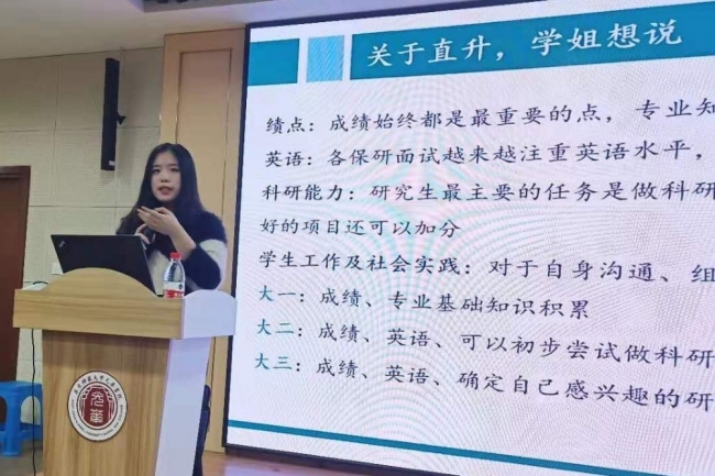 第二位嘉宾孙琳已保研至复旦大学环境科学专业。结合亲身经历,她向大家介绍了夏令营落选后的第二次推免机会,即预推免,要求在极短的准备时间内做好充足准备。而幸运的是,由于当年扩招,学姐在前去面试途中接到电话获知自己已直接通过,被复旦大学环境科学录取。学姐特意强调了过程中的心态问题,同学们需要调整好心态、明确自己内心的想法、静心科研、积极参与竞赛,毕竟不到最后一刻,一切都还是未知。