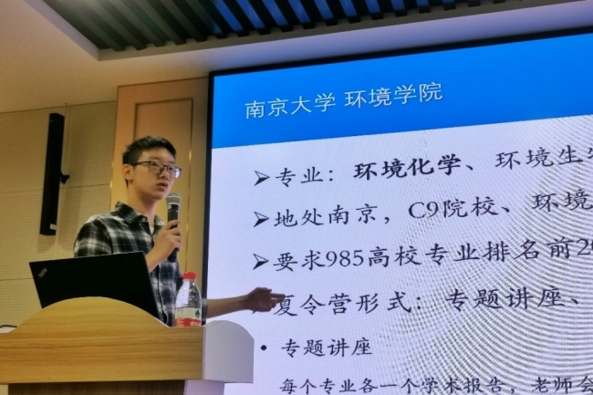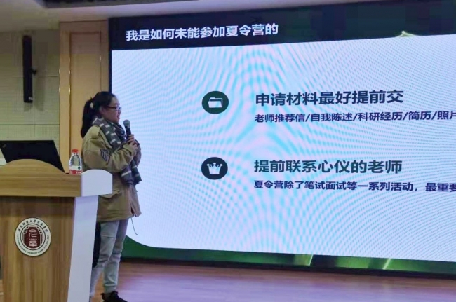已获得北京大学环境科学专业直博资格的徐力波率先登台,从什么是保研讲起。保研即推荐优秀应届本科毕业生免试攻读硕士学位研究生,许多同学会认为保研就是完全没有考核,其实保研过程中仍有诸多校内外的考核项目。旋即学长以自身参与的夏令营为例,总结分享了各个学校夏令营的报名要求、考核办法等,并分享了许多面试时的小技巧,提醒大家一定要趁早联系老师。最后学长也鼓励大家勇于尝试,因为你根本不会想到老师会从你的简历中挖掘出哪些闪光点,同时也强调要学好学科大类的专业知识,有助于扩大保研专业的选择面。